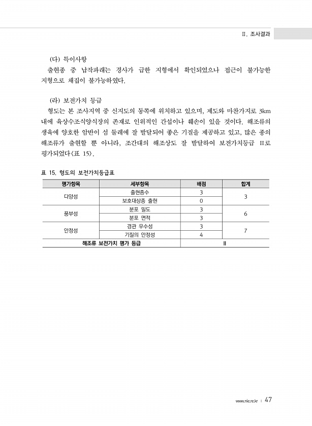 Ⅱ. 조사결과 www.nie.re.kr ? 47 다 특이사항 출현종 중 납작파래는 경사가 급한 지형에서 확인되었으나 접근이 불가능한 지형으로 채집이 불가능하였다. 라 보전가치 등급 형도는 본 조사지역 중 신지도의 동쪽에 위치하고 있으며, 제도와 마찬가지로 3km 내에 육상수조식양식장의 존재로 인위적인 간섭이나 훼손이 있을 것이다. 해조류의 생육에 양호한 암반이 섬 둘레에 잘 발달되어 좋은 기질을 제공하고 있고, 많은 종의 해조류가 출현할 뿐 아니라, 조간대의 해조상도 잘 발달하여 보전가치등급 Ⅱ로 평가되었다 표 15 표 15. 형도의 보전가치등급표 평가항목 세부항목 배점 합계 다양성 출현종수 3 3 보호대상종 출현 0 풍부성 분포 밀도 3 6 분포 면적 3 안정성 경관 우수성 3 7 기질의 안정성 4 해조류...