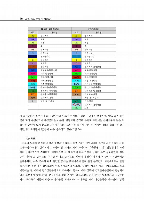 46 2015 독도 생태계 정밀조사 과 돌채송화가 혼생하며 보다 완만하고 다소의 퇴적토가 있는 사면에는 갯제비쑥, 개밀, 돌피 등이 곳에 따라 우점하거나 혼생군락을 이룬다. 탐방로와 정상부 주거지 주변에는 큰이삭풀과 같은 귀 화식물 군락이 넓게 분포한 가운데 다양한 노변식물 질경이, 마디풀, 바랭이 등 과 귀화식물 방가 지똥, 갓, 소리쟁이 등 들이 다수 생육하고 있다 그림 24 2 서도 서도의 남서쪽 완만한 사면부에 봄-여름철에는 개밀군락이 광범위하게 분포하나 여름철에는 가 는갯능쟁이군락이 형성되기 시작하여 본 지역을 거의 차지하고 가을철에는 가는갯능쟁이가 고사 하여 돌피군락으로 전환된다. 대체적으로 섬 전 지역에 여름-가을에 돌피가 분포 생육하였다. 섬의 중심 대한봉을 중심으로 수직형 암벽을 중심으로 해...