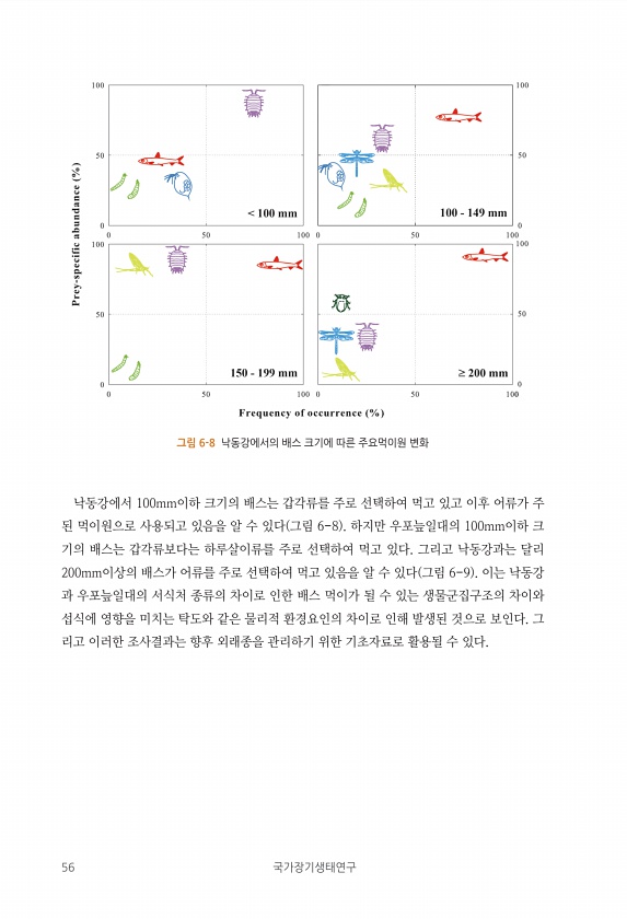 56 국가장기생태연구 낙동강에서 100mm이하 크기의 배스는 갑각류를 주로 선택하여 먹고 있고 이후 어류가 주 된 먹이원으로 사용되고 있음을 알 수 있다 그림 6-8 하지만 우포늪일대의 100mm이하 크 기의 배스는 갑각류보다는 하루살이류를 주로 선택하여 먹고 있다. 그리고 낙동강과는 달리 200mm이상의 배스가 어류를 주로 선택하여 먹고 있음을 알 수 있다 그림 6-9 이는 낙동강 과 우포늪일대의 서식처 종류의 차이로 인한 배스 먹이가 될 수 있는 생물군집구조의 차이와 섭식에 영향을 미치는 탁도와 같은 물리적 환경요인의 차이로 인해 발생된 것으로 보인다. 그 리고 이러한 조사결과는 향후 외래종을 관리하기 위한 기초자료로 활용될 수 있다. 그림 6-8 낙동강에서의 배스 크기에 따른 주요먹이원변화
