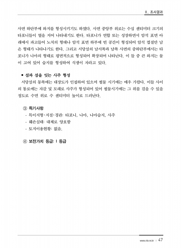 Ⅱ. 조사결과 www.nie.re.kr ? 47 사면 하단부에 와지를 형성시키기도 하였다. 사면 중앙부 위로는 수십 센티미터 크기의 타포니들이 열을 지어 나타내기도 한다. 타포니가 연합 또는 성장하면서 암석 표면 아 래에서 파고들어 노치의 형태나 암석 표면 하부에 빈 공간이 형성되어 암석 껍질만 남 은 형태가 나타나기도 한다. 그리고 서당섬의 남서쪽과 남쪽 사면의 중하단부에서는 타 포니가 나마의 형태로 평면적으로 형성되어 확장되어 나타난다. 이 들 중 큰 와지는 물 이 고여 있어 습지를 형성하여 식생이 자라고 있다. ? 섬과 섬을 잇는 사주 형성 서당섬의 동쪽에는 대장도가 인접하여 있으며 썰물 시기에는 매우 가깝다. 이들 사이 의 통로에는 자갈 및 모래로 사주가 형성되어 있어 썰물시기에는 그 위를 걸을 수 ...