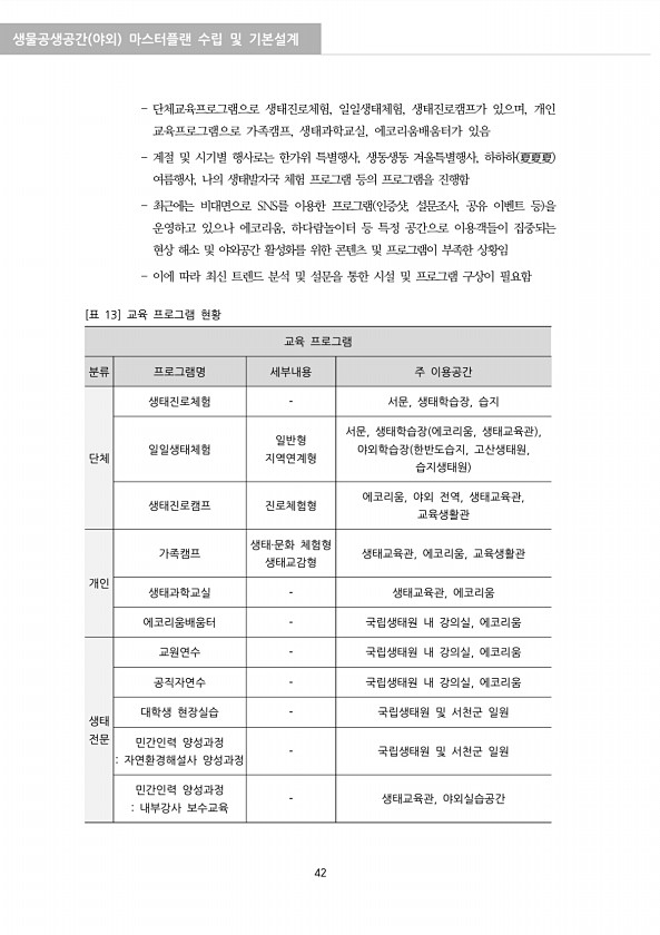 생물공생공간 야외 마스터플랜 수립 및 기본설계 42 단체교육프로그램으로 생태진로체험, 일일생태체험, 생태진로캠프가 있으며, 개인 교육프로그램으로 가족캠프, 생태과학교실, 에코리움배움터가 있음 계절 및 시기별 행사로는 한가위 특별행사, 생동생동 겨울특별행사, 하하하 夏夏夏 여름행사, 나의 생태발자국 체험 프로그램 등의 프로그램을 진행함 최근에는 비대면으로 SNS를 이용한 프로그램 인증샷, 설문조사, 공유 이벤트 등 을 운영하고 있으나 에코리움, 하다람놀이터 등 특정 공간으로 이용객들이 집중되는 현상 해소 및 야외공간 활성화를 위한 콘텐츠 및 프로그램이 부족한 상황임 이에 따라 최신 트렌드 분석 및 설문을 통한 시설 및 프로그램 구상이 필요함 교육 프로그램 분류 프로그램명 세부내용 주 이용공간 단체 생태진로체험...
