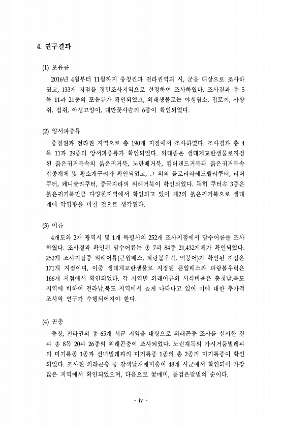 iv 4. 연구결과 1 포유류 2016년 4월부터 11월까지 충청권과 전라권역의 시, 군을 대상으로 조사하 였고, 133개 지점을 정밀조사지역으로 선정하여 조사하였다. 조사결과 총 5 목 11과 21종의 포유류가 확인되었고, 외래생물로는 야생염소, 집토끼, 사향 쥐, 집쥐, 야생고양이, 대만꽃사슴의 6종이 확인되었다. 2 양서파충류 충청권과 전라권 지역으로 총 190개 지점에서 조사하였다. 조사결과 총 4 목 11과 29종의 앙서파충류가 확인되었다. 외래종은 생태계교란생물로지정 된 붉은귀거북속의 붉은귀거북, 노란배거북, 컴버랜드거북과 붉은귀거북속 잡종개체 및 황소개구리가 확인되었고, 그 외의 플로리라레드밸리쿠터, 리버 쿠터, 페니슐라쿠터, 중국자라의 외래거북이 확인되었다. 특히 쿠터속 3종은 붉은귀거북만큼 ...