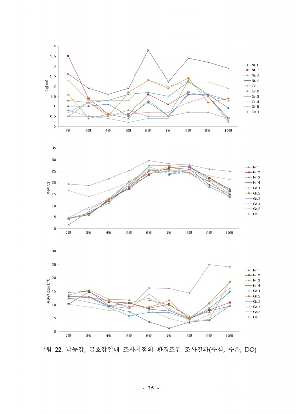 35 그림 22. 낙동강, 금호강일대 조사지점의 환경조건 조사결과 수심, 수온, DO