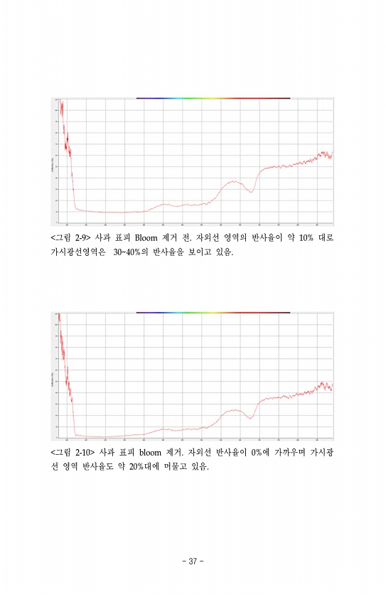 그림 2-9 사과 표피 Bloom 제거 전. 자외선 영역의 반사율이 약 10% 대로 가시광선영역은 3040%의 반사율을 보이고 있음. 그림 2-10 사과 표피 bloom 제거. 자외선 반사율이 0%에 가까우며 가시광 선 영역 반사율도 약 20%대에 머물고 있음. 37