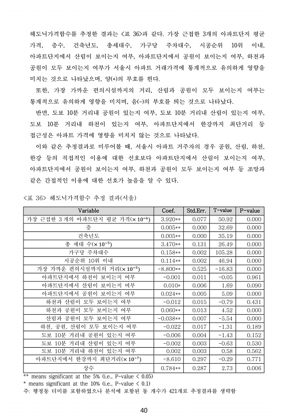 40 헤도닉가격함수를 추정한 결과는 표 36 과 같다. 가장 근접한 3개의 아파트단지 평균 가격, 층수, 건축년도, 총세대수, 가구당 주차대수, 시공순위 10위 이내, 아파트단지에서 산림이 보이는지 여부, 아파트단지에서 공원이 보이는지 여부, 하천과 공원이 모두 보이는지 여부가 서울시 아파트 거래가격에 통계적으로 유의하게 영향을 미치는 것으로 나타났으며, 양 + 의 부호를 띈다. 또한, 가장 가까운 편의시설까지의 거리, 산림과 공원이 모두 보이는지 여부는 통계적으로 유의하게 영향을 미치며, 음 의 부호를 띄는 것으로 나타났다. 반면, 도보 10분 거리내 공원이 있는지 여부, 도보 10분 거리내 산림이 있는지 여부, 도보 10분 거리내 하천이 있는지 여부, 아파트단지에서 한강까지 최단거리 등 접근성은 아파트 ...