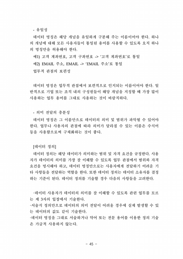 유일성 데이터 명칭은 해당 개념을 유일하게 구분해 주는 이름이어야 한다. 하나 의 개념에 대해 모든 사용자들이 통일된 용어를 사용할 수 있도록 오직 하나 의 명칭만을 허용해야 한다. 예1 고객 계좌번호, 고객 구좌번호 ‘고객 계좌번호’로 통일 예2 EMAIL 주소, EMAIL ‘EMAIL 주소’로 통일 업무적 관점의 보편성 데이터 명칭은 업무적 관점에서 보편적으로 인지되는 이름이어야 한다. 일 반적으로 기업 또는 조직 내의 구성원들이 해당 개념을 지칭할 때 가장 많이 사용하는 업무 용어를 그대로 사용하는 것이 바람직하다. 의미 전달의 충분성 데이터 명칭은 그 이름만으로 데이터의 의미 및 범위가 파악될 수 있어야 한다. 업무나 사용자의 관점에 따라 의미가 달라질 수 있는 이름은 수식어 등을 사용함으로써 구체화...