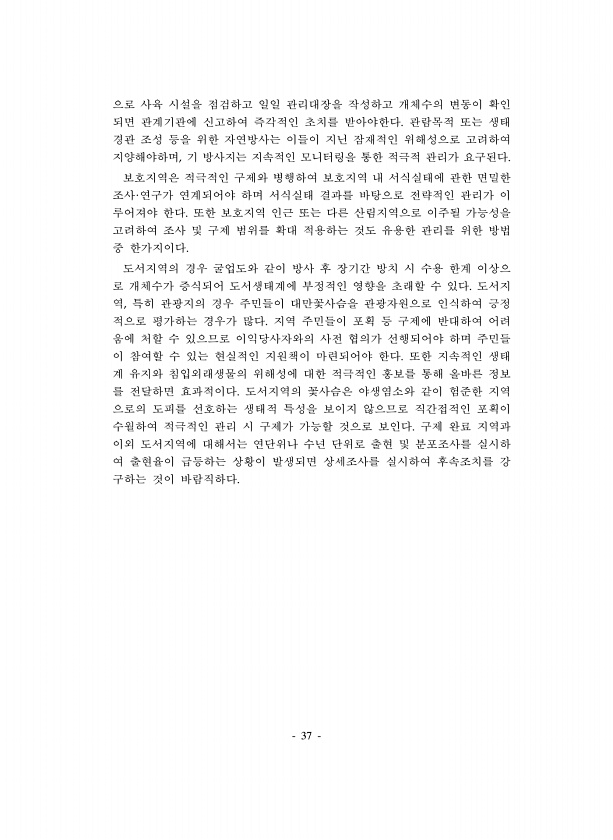 37 으로 사육 시설을 점검하고 일일 관리대장을 작성하고 개체수의 변동이 확인 되면 관계기관에 신고하여 즉각적인 초치를 받아야한다. 관람목적 또는 생태 경관 조성 등을 위한 자연방사는 이들이 지닌 잠재적인 위해성으로 고려하여 지양해야하며, 기 방사지는 지속적인 모니터링을 통한 적극적 관리가 요구된다. 보호지역은 적극적인 구제와 병행하여 보호지역 내 서식실태에 관한 면밀한 조사·연구가 연계되어야 하며 서식실태 결과를 바탕으로 전략적인 관리가 이 루어져야 한다. 또한 보호지역 인근 또는 다른 산림지역으로 이주될 가능성을 고려하여 조사 및 구제 범위를 확대 적용하는 것도 유용한 관리를 위한 방법 중 한가지이다. 도서지역의 경우 굴업도와 같이 방사 후 장기간 방치 시 수용 한계 이상으 로 개체수가 증식되어 도서생태...