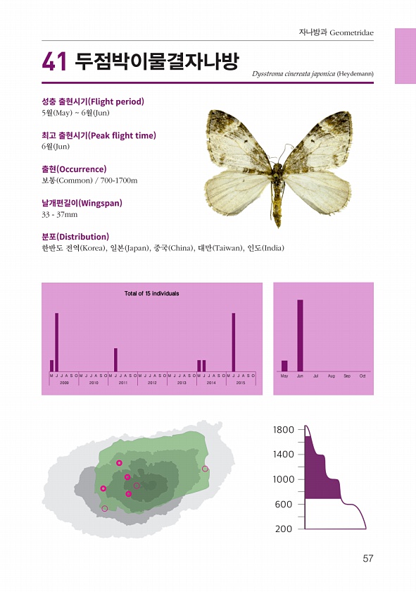 57 자나방과 Geometridae Dysstroma cinereata japonica Heydemann 성충 출현시기 Flight period 5월 May 6월 Jun 최고 출현시기 Peak fight time 6월 Jun 출현 Occurrence 보통 Common 700-1700m 날개편길이 Wingspan 33 37mm 분포 Distribution 한반도 전역 Korea , 일본 Japan , 중국 China , 대만 Taiwan , 인도 India M J J A S O M J J A S O M J J A S O M J J A S O M J J A S O M J J A S O M J J A S O May Jun Jul Aug Sep Oct 2009 2010 2011 2012 2013 2014 2015 ...