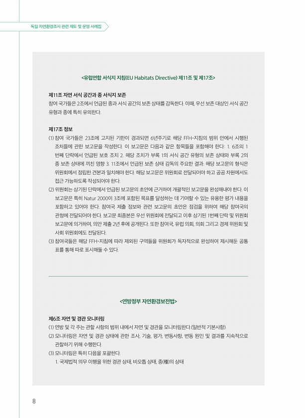 독일 자연환경조사 관련 제도 및 운영 사례집 유럽연합 서식지 지침 EU Habitats Directive 제11조 및 제17조 제11조 자연 서식 공간과 종 서식지 보존 참여 국가들은 2조에서 언급된 종과 서식 공간의 보존 상태를 감독한다. 이때, 우선 보존 대상인 서식 공간 유형과 종에 특히 유의한다. 제17조 정보 1 참여 국가들은 23조에 고지된 기한이 경과되면 6년주기로 해당 FFH-지침의 범위 안에서 시행된 조처들에 관한 보고문을 작성한다. 이 보고문은 다음과 같은 항목들을 포함해야 한다1. 6조의 1 번째 단락에서 언급된 보호 조치 2. 해당 조치가 부록 1의 서식 공간 유형의 보존 상태와 부록 2의 종 보존 상태에 끼친 영향 3. 11조에서 언급된 보존 상태 감독의 주요한 결과. 해당 보고문의 ...