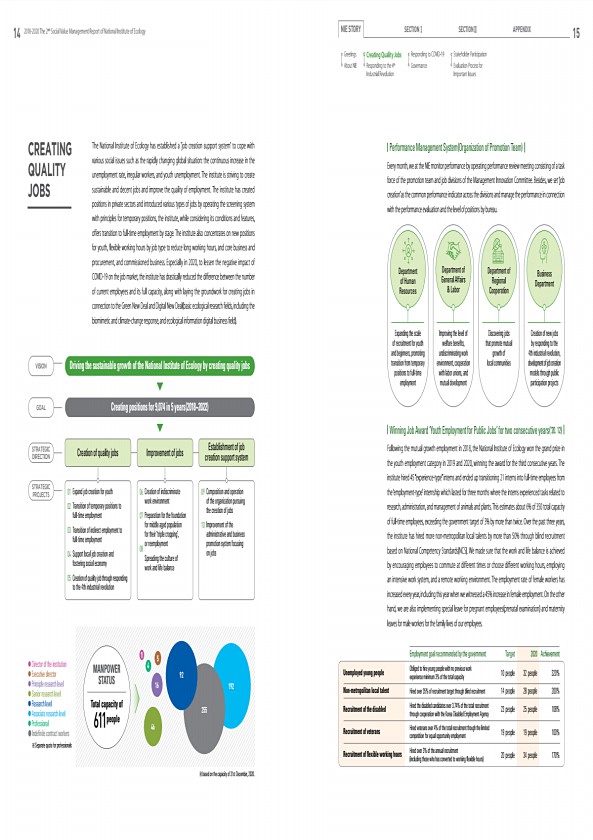 14 2018-2020 The 2nd Social Value Management Report of National Institute of Ecology NIE STORY SECTIONⅠ SECTIONⅡ APPENDIX 15 Unemployed young people Non-metropolitan local talent Recruitment of the disabled Recruitment of veterans Recruitment of flexible working hours Obliged to hire young people with no previous work experience minimum 3% of the total capacity Hired over 35% of recruitment target...