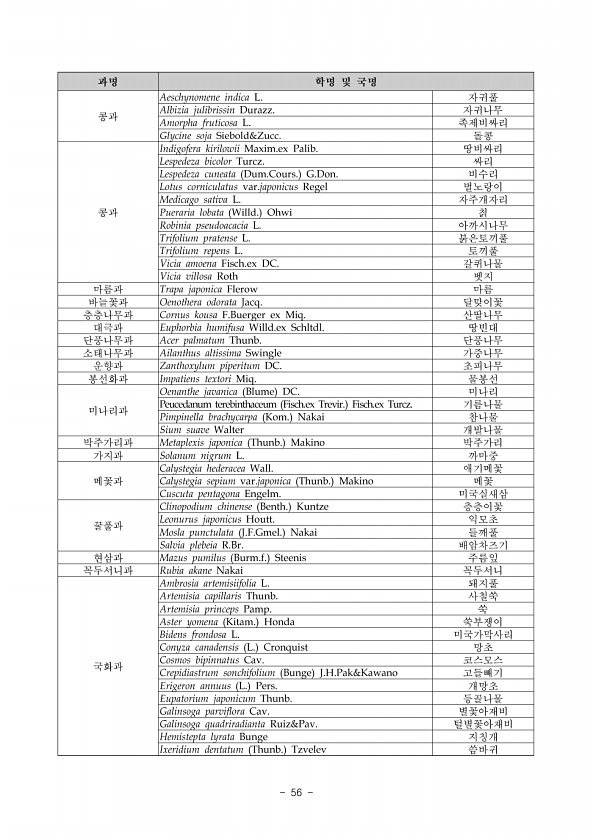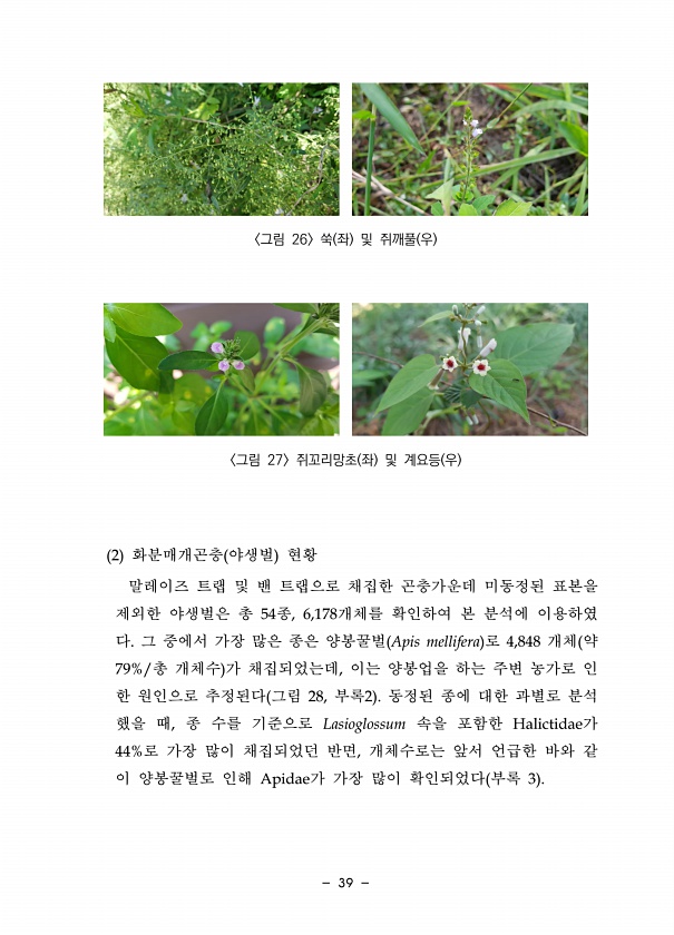 39 그림 26 쑥 좌 및 쥐깨풀 우 그림 27 쥐꼬리망초 좌 및 계요등 우 2 화분매개곤충 야생벌 현황 말레이즈 트랩 및 밴 트랩으로 채집한 곤충가운데 미동정된 표본을 제외한 야생벌은 총 54종, 6,178개체를 확인하여 본 분석에 이용하였 다. 그 중에서 가장 많은 종은 양봉꿀벌 Apis mellifera 로 4,848 개체 약 79%/총 개체수 가 채집되었는데, 이는 양봉업을 하는 주변 농가로 인 한 원인으로 추정된다 그림 28, 부록2 동정된 종에 대한 과별로 분석 했을 때, 종 수를 기준으로 Lasioglossum 속을 포함한 Halictidae가 44%로 가장 많이 채집되었던 반면, 개체수로는 앞서 언급한 바와 같 이 양봉꿀벌로 인해 Apidae가 가장 많이 확인되었다 부록 3