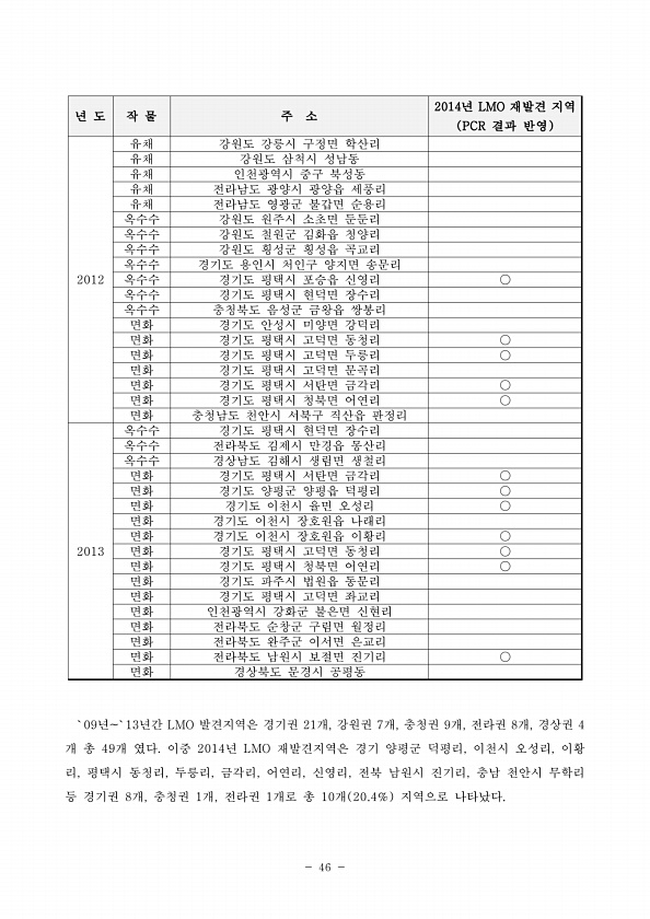 46 년 도 작 물 주 소 2014년 LMO 재발견 지역 PCR 결과 반영 2012 유채 강원도 강릉시 구정면 학산리 유채 강원도 삼척시 성남동 유채 인천광역시 중구 북성동 유채 전라남도 광양시 광양읍 세풍리 유채 전라남도 영광군 불갑면 순용리 옥수수 강원도 원주시 소초면 둔둔리 옥수수 강원도 철원군 김화읍 청양리 옥수수 강원도 횡성군 횡성읍 곡교리 옥수수 경기도 용인시 처인구 양지면 송문리 옥수수 경기도 평택시 포승읍 신영리 ○ 옥수수 경기도 평택시 현덕면 장수리 옥수수 충청북도 음성군 금왕읍 쌍봉리 면화 경기도 안성시 미양면 강덕리 면화 경기도 평택시 고덕면 동청리 ○ 면화 경기도 평택시 고덕면 두릉리 ○ 면화 경기도 평택시 고덕면 문곡리 면화 경기도 평택시 서탄면 금각리 ○ 면화 경기도 평택시 청북면 ...