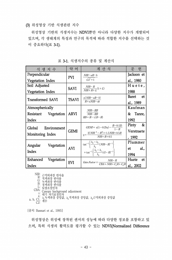 43 위성영상 기반 식생관련 지수 위성영상 기반의 식생지수는 뿐만 아니라 다양한 지수가 개발되어 있으며 각 생태계의 특징과 연구의 목적에 따라 적합한 지수를 선택하는 것 이 중요하다 표 식 생 지 수 약 어 계 산 식 문 헌 ? ? ? ???? ? ? tan tan ???????? × NIRR...