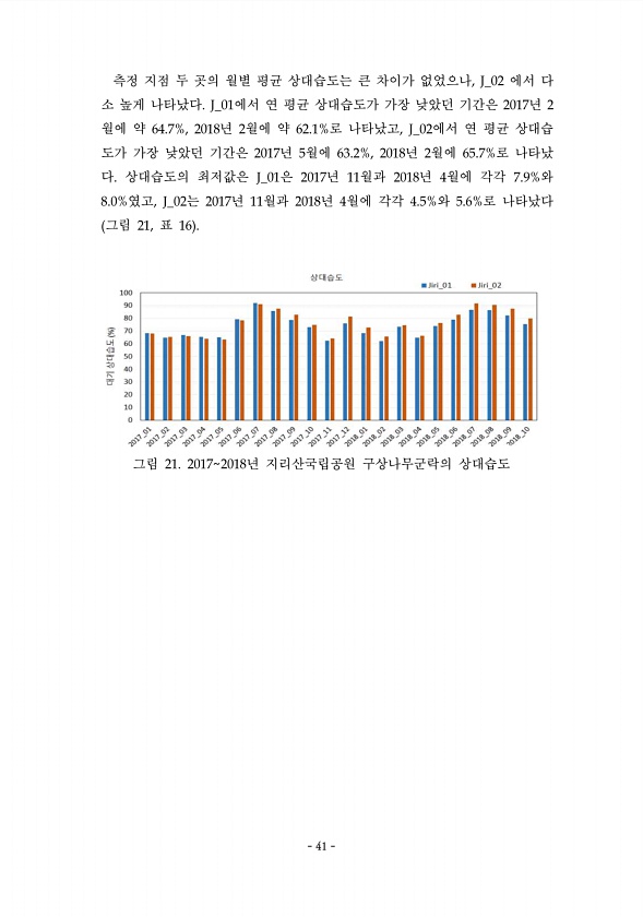 41 측정 지점 두 곳의 월별 평균 상대습도는 큰 차이가 없었으나, J_02 에서 다 소 높게 나타났다. J_01에서 연 평균 상대습도가 가장 낮았던 기간은 2017년 2 월에 약 64.7%, 2018년 2월에 약 62.1%로 나타났고, J_02에서 연 평균 상대습 도가 가장 낮았던 기간은 2017년 5월에 6V.2%, 2018년 2월에 65.7%로 나타났 다. 상대습도의 최저값은 J_01은 2017년 11월과 2018년 4월에 각각 7.9%와 8.0%였고, J_02는 2017년 11월과 2018년 4월에 각각 4.5%와 5.6%로 나타났다 그림 21, 표 16M. 그림 21. 2017O2018년 지리산국립공원 구상나무군락의 상대습도 41
