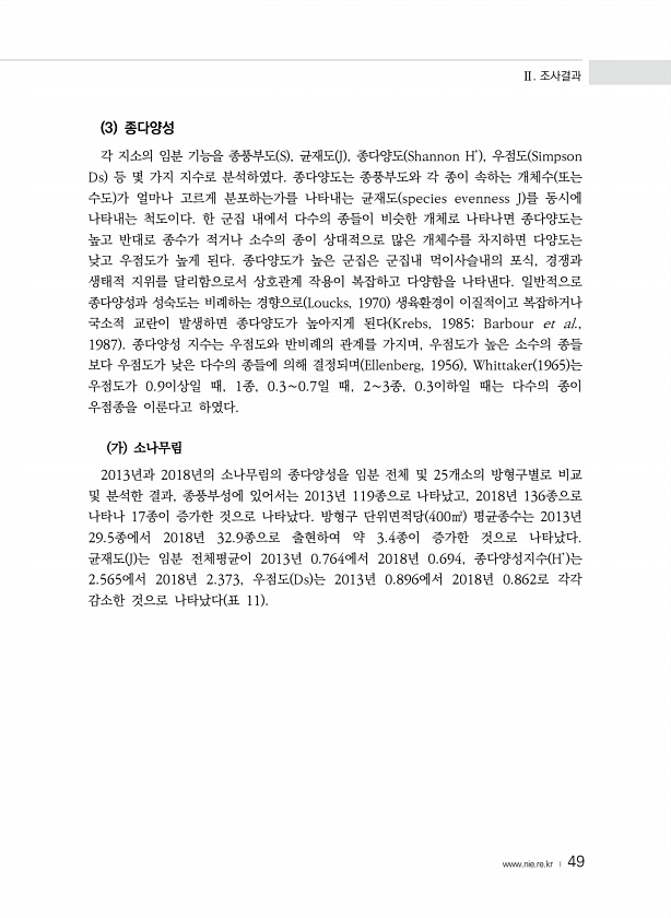 Ⅱ. 조사결과 www.nie.re.kr ? 49 3 종다양성 각 지소의 임분 기능을 종풍부도 S , 균재도 J , 종다양도 Shannon H’ , 우점도 Simpson Ds 등 몇 가지 지수로 분석하였다. 종다양도는 종풍부도와 각 종이 속하는 개체수 또는 수도 가 얼마나 고르게 분포하는가를 나타내는 균재도 species evenness J 를 동시에 나타내는 척도이다. 한 군집 내에서 다수의 종들이 비슷한 개체로 나타나면 종다양도는 높고 반대로 종수가 적거나 소수의 종이 상대적으로 많은 개체수를 차지하면 다양도는 낮고 우점도가 높게 된다. 종다양도가 높은 군집은 군집내 먹이사슬내의 포식, 경쟁과 생태적 지위를 달리함으로서 상호관계 작용이 복잡하고 다양함을 나타낸다. 일반적으로 종다양성과 성숙도는 비례하는 경...