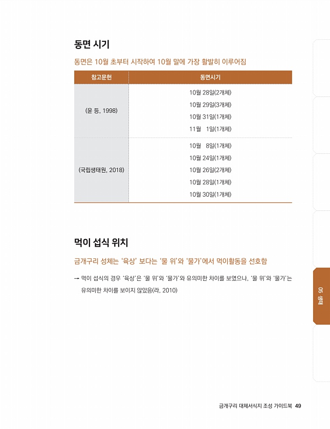 05. 금개구리의 생태 05 생태 동면 시기 동면은 10월 초부터 시작하여 10월 말에 가장 활발히 이루어짐 먹이 섭식 위치 금개구리 성체는 ‘육상’ 보다는 ‘물 위’와 ‘물가’에서 먹이활동을 선호함 → 먹이 섭식의 경우 ‘육상’은 ‘물 위’와 ‘물가’와 유의미한 차이를 보였으나, ‘물 위’와 ‘물가’는 유의미한 차이를 보이지 않았음 라, 2010 참고문헌 동면시기 윤 등, 1998 10월 28일 2개체 10월 29일 3개체 10월 31일 1개체 11월 1일 1개체 국립생태원, 2018 10월 8일 1개체 10월 24일 1개체 10월 26일 2개체 10월 28일 1개체 10월 30일 1개체 금개구리 대체서식지 조성 가이드북49