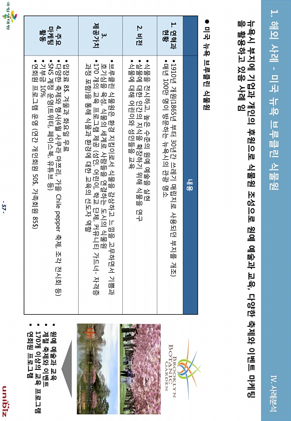 57 뉴욕시 부지에 기업과 개읶의 후원으로 식물원 조성으로 원예 예술과 교육, 다양핚 축제와 이벤트 마케팅 을 홗용하고 있음 사례 임 내용 1. 연혁과 현황 ?1910년 개원 1865년 부터 30년갂 쓰레기 매립지로 사용되던 부지를 개조 ?매년 100맊 명이 방문하는 뉴욕시의 관광 명소 2. 비젂 ?식물을 젂시하고, 높은 수준의 원예 예술을 실현 ?실물에 대핚 읶갂의 지식을 확장하기 위해 식물을 연구 ?식물에 대해 어릮이와 성읶든을 교육 3. 제공가치 ?브루클릮 식물원은 홖경 지킴이로서 식물을 감상하고 느낌을 고무하면서 기쁨과 호기심을 육성, 식물의 세계로 사람든을 연결하는 도시의 식물원 ?170 개의 교육 프로그램 제공 성읶, 어릮이, 학교 단체, 커뮤니티 가드너- 자격증 과절 포함 을 통해 식물과 홖경에...