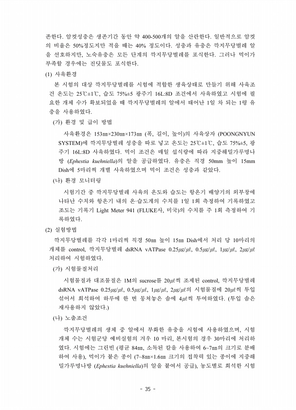 35 400-500 50% 40% , 1 25℃±1℃, 75%±5 16L8D 1 1 153㎜×230㎜×173㎜ , , POONGNYUN SYSTEM 25℃±1℃, 75%±5, 16L8D Ephestia kuehniella 50mm 15mm Dish 5 · 1 1 Light Meter 941 FLUKE , 1 2 1 50㎜ 15㎜ Dish 10 control, dsRNA vATPase 0.25㎍/㎕, 0.5㎍/㎕, 1㎍/㎕, 2㎍/㎕ 1M sucrose 20㎕ control, dsRNA vATPase 0.25㎍/㎕, 0.5㎍/㎕, 1㎍/㎕, 2㎍/㎕ 20㎕ 4㎕ , 10 , 30 84㎜, 67㎜ , 78㎜×1.6㎜ Ephestia kuehniella ,