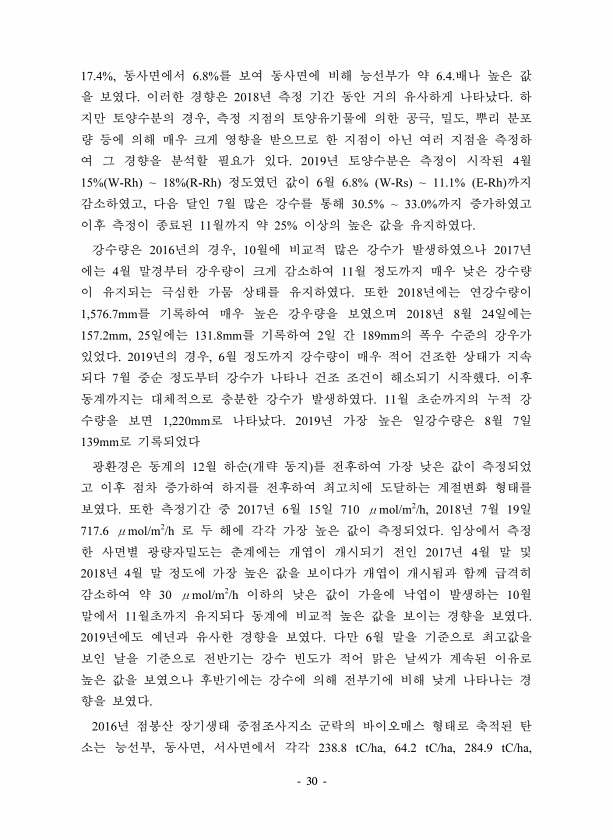 30 17.4%, 6.8% 6.4. 2018 , , , 2019 4 15% W-Rh 18% R-Rh 6 6.8% W-Rs 11.1% E-Rh , 7 30.5% 33.0% 11 25% 2016 , 10 2017 4 11 2018 1,576.7mm 2018 8 24 157.2mm, 25 131.8mm 2 189mm 2019 , 6 7 11 1,220mm 2019 8 7 139mm 12 2017 6 15 710 mol/m2/h, 2018 7 19 717.6 mol/m2/h 2017 4 2018 4 30 mol/m2/h 10 11 2019 6 2016 , , 238.8 tC/ha, 64.2 tC/ha, 284.9tC/ha,