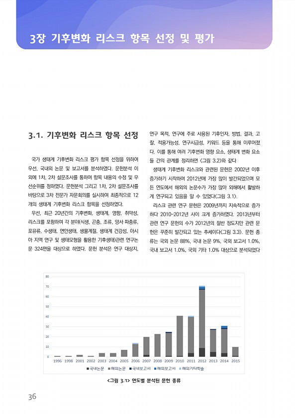생태계에 대한 기후변화 리스크 평가 36 3.1. 기후변화 리스크 항목 선정 국가 생태계 기후변화 리스크 평가 항목 선정을 위하여 우선, 국내외 논문 및 보고서를 분석하였다. 문헌분석 이 외에 1차, 2차 설문조사를 통하여 항목 내용의 수정 및 우 선순위를 정하였다. 문헌분석 그리고 1차, 2차 설문조사를 바탕으로 3차 전문가 자문회의를 실시하여 최종적으로 12 개의 생태계 기후변화 리스크 항목을 선정하였다. 우선, 최근 20년간의 기후변화, 생태계, 영향, 취약성, 리스크를 포함하여 각 분야 식생, 곤충, 조류, 양서·파충류, 포유류, 수생태, 연안생태, 생물계절, 생태계 건강성, 아시 아 지역 연구 및 생태모형을 활용한 기후생태 관련 연구논 문 324편을 대상으로 하였다. 문헌 분석은 연구 대상지, 연구...