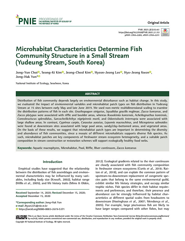 Microhabitat Characteristics Determine Fish Community Structure in a Small Stream Yudeung Stream, South Korea Jong-Yun Choi , Seong-Ki Kim , Jeong-Cheol Kim , Hyeon-Jeong Lee , Hyo-Jeong Kwon , Jong-Hak Yun* National Institute of Ecology, Seocheon, Korea This is an Open Access article distributed under the terms of the Creative Commons Attribution Non-Commercial License http//creativecommons.org/l...
