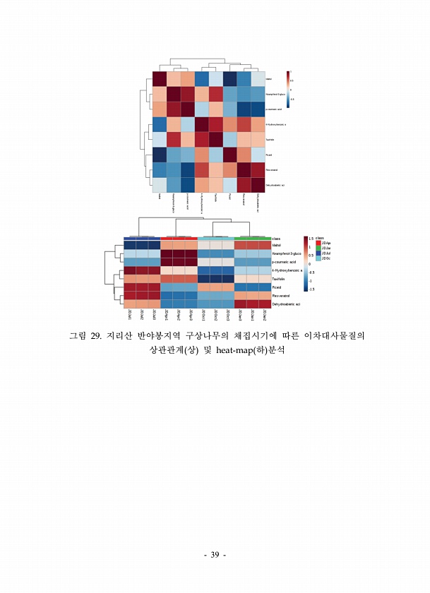 39 그림 29. 지리산 반야봉지역 구상나무의 채집시기에 따른 이차대사물질의 상관관계 상 및 heat-map 하분석