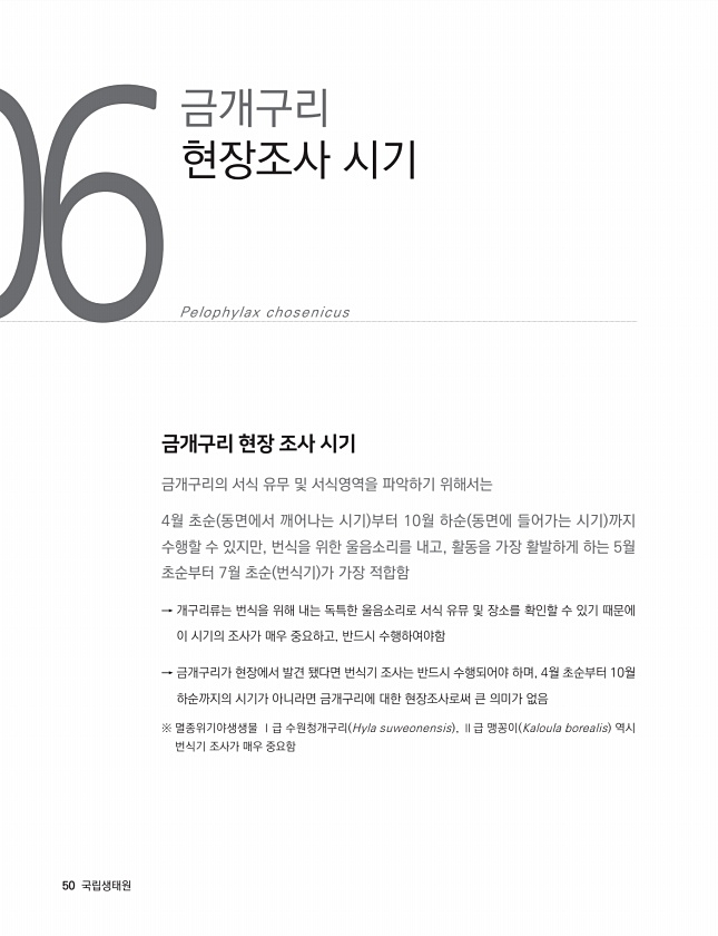 금개구리 현장 조사 시기 금개구리의 서식 유무 및 서식영역을 파악하기 위해서는 4월 초순 동면에서 깨어나는 시기 부터 10월 하순 동면에 들어가는 시기 까지 수행할 수 있지만, 번식을 위한 울음소리를 내고, 활동을 가장 활발하게 하는 5월 초순부터 7월 초순 번식기 가 가장 적합함 → 개구리류는 번식을 위해 내는 독특한 울음소리로 서식 유뮤 및 장소를 확인할 수 있기 때문에 이 시기의 조사가 매우 중요하고, 반드시 수행하여야함 → 금개구리가 현장에서 발견 됐다면 번식기 조사는 반드시 수행되어야 하며, 4월 초순부터 10월 하순까지의 시기가 아니라면 금개구리에 대한 현장조사로써 큰 의미가 없음 ※ 멸종위기야생생물 Ⅰ급 수원청개구리 Hyla suweonensis , Ⅱ급 맹꽁이 Kaloula borealis 역...