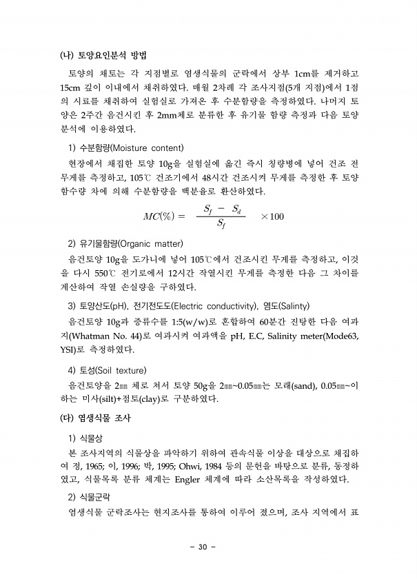 30 나 토양요인분석 방법 토양의 채토는 각 지점별로 염생식물의 군락에서 상부 1cm를 제거하고 15cm 깊이 이내에서 채취하였다. 매월 2차례 각 조사지점 5개 지점 에서 1점 의 시료를 채취하여 실험실로 가져온 후 수분함량을 측정하였다. 나머지 토 양은 2주간 음건시킨 후 2mm체로 분류한 후 유기물 함량 측정과 다음 토양 분석에 이용하였다. 1 수분함량 Moisture content 현장에서 채집한 토양 10g을 실험실에 옮긴 즉시 칭량병에 넣어 건조 전 무게를 측정하고, 105℃ 건조기에서 48시간 건조시켜 무게를 측정한 후 토양 함수량 차에 의해 수분함량을 백분율로 환산하였다. ? ? ? × 2 유기물함량 Organic matter 음건토양 10g을 도가니에 넣...