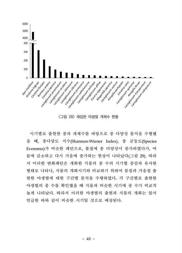40 그림 28 채집한 야생벌 개체수 현황 시기별로 출현한 종과 개체수를 바탕으로 종 다양성 분석을 수행했 을 때, 종다양도 지수 Shannon-Wiener Index , 종 균등도 Species Evenness 가 비슷한 패턴으로, 봄철에 종 다양성이 증가하였다가, 여 름에 감소하고 다시 가을에 증가하는 현상이 나타났다 그림 29 따라 서 이러한 변화패턴은 개화한 식물의 종 수의 시기별 증감과 유사한 형태로 나타나, 식물의 개화시기와 비교하기 위하여 봄철과 가을철 출 현한 야생벌에 대한 구간별 분석을 수행하였다. 각 구간별로 출현한 야생벌의 종 수를 확인했을 때 식물과 비슷한 시기에 종 수가 비교적 높게 나타났다. 따라서 이러한 야생벌의 출현과 식물의 개화는 앞서 언급한 바와 같이 비슷한 시기일 것으로예상...