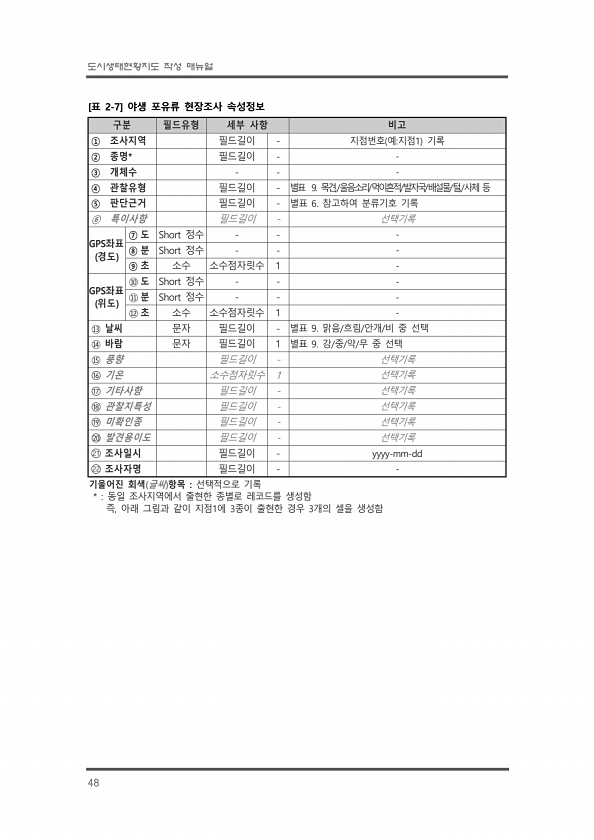 도시생태현황지도 작성 매뉴얼 48 구분 필드유형 세부 사항 비고 ① 조사지역 필드길이 지점번호 예지점1 기록 ② 종명* 필드길이 ③ 개체수 ④ 관찰유형 필드길이 별표 9. 목견,/울음소리/먹이흔적/발자국/배설물/털,/사체 등 ⑤ 판단근거 필드길이 별표 6. 참고하여 분류기호 기록 ⑥ 특이사항 필드길이 선택기록 GPS좌표 경도 ⑦ 도 Short 정수 ⑧ 분 Short 정수 ⑨ 초 소수 소수점자릿수 1 GPS좌표 위도 ⑩ 도 Short 정수 ⑪ 분 Short 정수 ⑫ 초 소수 소수점자릿수 1 ⑬ 날씨 문자 필드길이 별표 9. 맑음/흐림/안개/비 중 선택 ⑭ 바람 문자 필드길이 1 별표 9. 강/중/약/무 중 선택 ⑮ 풍향 필드길이 선택기록 ? 기온 소수점자릿수 1 선택기록 ? 기타사항 필드길이 선택기록 ? 관찰...