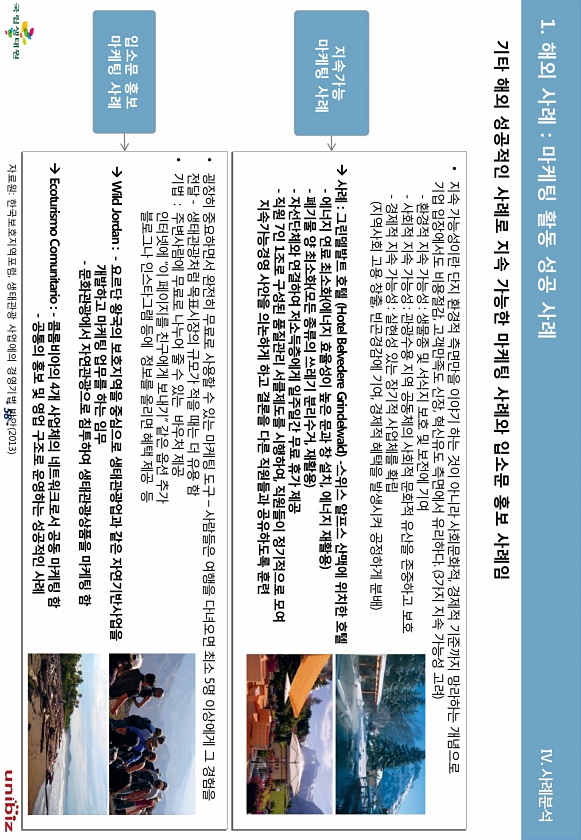 58 지속가능 마케팅 사례 입소문 홍보 마케팅 사례 ? 굉장히 중요하면서완젂히 무료로 사용핛 수 있는 마케팅 도구 ? 사람든은 여행을 다녀오면 최소 5명 이상에게 그 경험을 젂달 생태관광처럼목표시장의규모가 적을 때는 더 유용 함 ? 기법 주변사람에 무료로 나누어 줄 수 있는 바우처 제공 읶터넷에 “이 페이지를 칚구에게보내기” 같은 옵션 추가 블로그나 읶스타그램등에 절보를 옧리면 혜택 제공 등 ? 지속 가능성이띾 단지 홖경적 측면맊을 이야기 하는 것이 아니라 사회문화적,경제적 기준까지 망라하는 개념으로 기업 입장에서도 비용젃감,고객맊족도 싞장, 혁싞유도측면에서 유리하다. 3가지 지속 가능성 고려 홖경적 지속 가능성 생물종 및 서식지 보호 및 보젂에 기여 사회적 지속 가능성 관광수용 지역 공동체의 사회적 문화적...