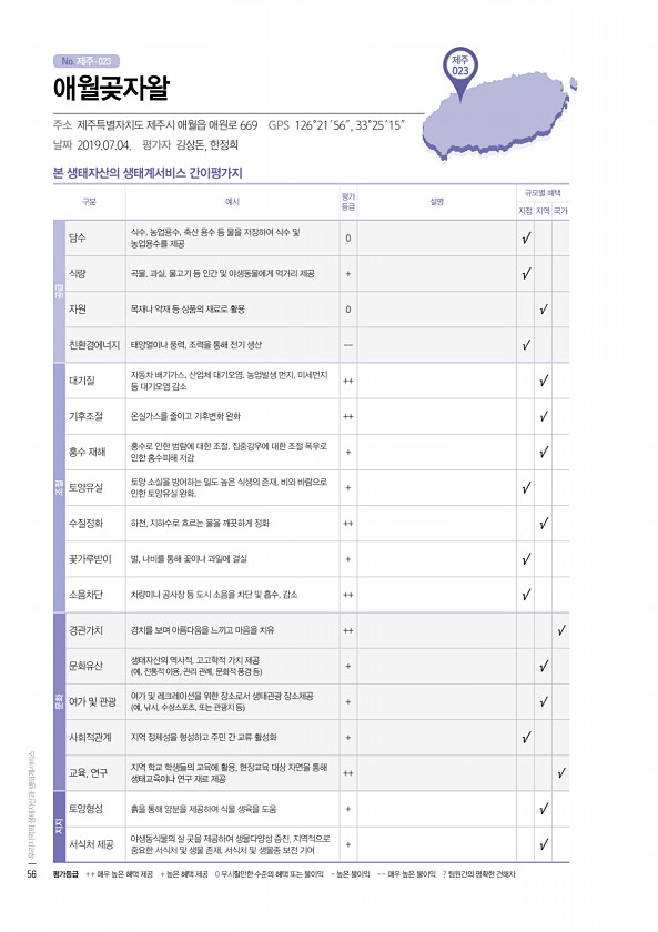 No. 제주- 제주 023 본 생태자산의 생태계서비스 간이평가지 구분 예시 평가 등급 설명 규모별 혜택 지점 지역 국가 공급 담수 식수, 농업용수, 축산 용수 등 물을 저장하여 식수 및 농업용수를 제공 0 √ 식량 곡물, 과실, 물고기 등 인간 및 야생동물에게 먹거리 제공 + √ 자원 목재나 약재 등 상품의 재료로 활용 0 √ 친환경에너지 태양열이나 풍력, 조력을 통해 전기 생산 -- √ 조절 대기질 자동차 배기가스, 산업체 대기오염, 농업발생 먼지, 미세먼지 등 대기오염 감소 ++ √ 기후조절 온실가스를 줄이고 기후변화 완화 ++ √ 홍수 재해 홍수로 인한 범람에 대한 조절, 집중강우에 대한 조절 폭우로 인한 홍수피해 저감 + √ 토양유실 토양 소실을 방어하는 밀도 높은 식생의 존재, 비와 바람으로 인한 ...