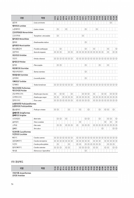 56 솔잣새 Loxia curvirostra ○ 때까치과 Laniidae 노랑때까치 Lanius cristatus ○ ○ ○ ○ 긴꼬리딱새과 Monarchidae 긴꼬리딱새 Terpsiphone atrocaudata ○ ○ 할미새과 Motacillidae 물레새 Dendronanthus indicus ○ 솔딱새과 Muscicapidae 흰눈썹황금새 Ficedula zanthopygia ○ ○ ○ ○ ○ 검은딱새 Saxicola torquatus ○ ○ ○ ○ ○ ○ ○ ○ ○ ○ ○ ○ ○ ○ ○ ○ ○ ○ 꾀꼬리과 Oriolidae 꾀꼬리 Oriolus chinensis ○ ○ ○ ○ ○ ○ ○ ○ ○ ○ ○ ○ ○ ○ ○ ○ ○ ○ ○ ○ ○ ○ 팔색조과 Pittidae 팔색조 Pitta nympha ○...