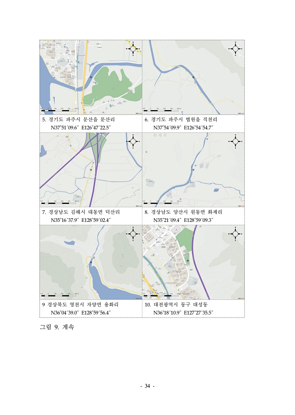 34 5. 경기도 파주시 문산읍 문산리 N37˚51´09.6˝ E126˚47´22.5˝ 6. 경기도 파주시 법원읍 직천리 N37˚54´09.9˝ E126˚54´54.7˝ 7. 경상남도 김해시 대동면 덕산리 N35˚16´37.9˝ E128˚59´02.4˝ 8. 경상남도 양산시 원동면 화제리 N35˚21´09.4˝ E128˚59´09.3˝ 9 경상북도 영천시 자양면 용화리 N36˚04´39.0˝ E128˚59´56.4˝ 10. 대전광역시 동구 대성동 N36˚18´10.9˝ E127˚27´35.5˝ 그림 9.계속