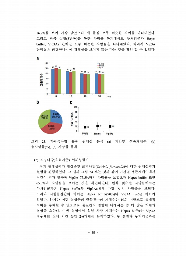 39 16.7%를 보여 가장 낮았으나 세 물질 보두 비슷한 차이를 나타내었다. 그리고 반복 실험 3반복 을 통한 사망률 통계에서도 무처리군과 Hepes buffer, Vip3Aa 단백질 모두 비슷한 사망률을 나타내었다. 따라서 Vip3A 단백질은 화랑곡나방에 위해성을 보이지 않는 다는 것을 확인 할 수 있었다. 그림 23. 화랑곡나방 유충 위해성 분석 a 기간별 생존개체수, b 총사망률 % , c 사망률 통계 2 조명나방 초식자군 위해성평가 장기 위해성평가 대상종인 조명나방 Ostrinia furnacalis 에 대한 위해성평가 실험을 진행하였다. 그 결과 그림 24 보는 것과 같이 기간별 생존개체수에서 시간이 경과 할수록 Vip3A 75.5%까지 사망률을 보였으며 Hepes buffer 또한 65.3%의 ...