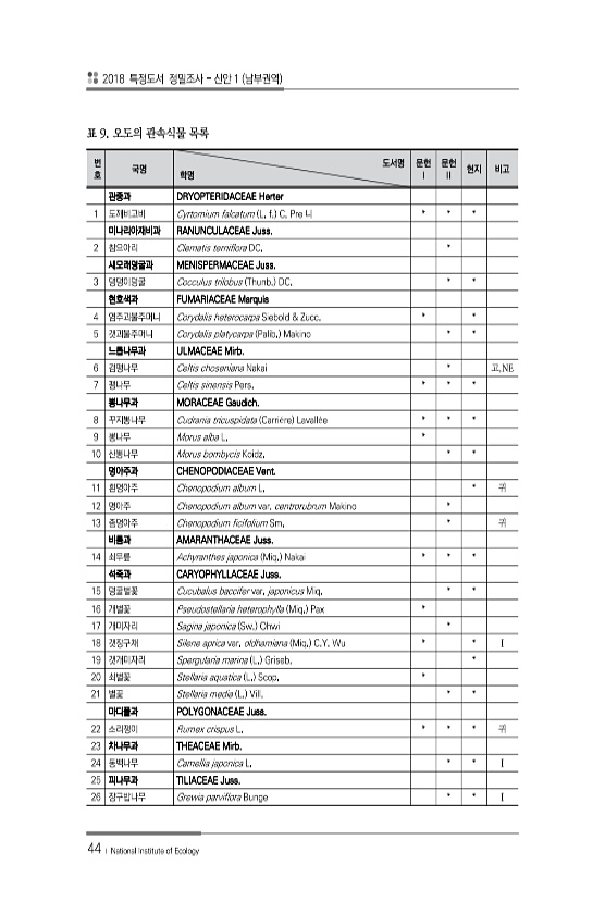 2018 특정도서 정밀조사 신안 1 남부권역 44 ? National Institute of Ecology 번 호 국명 도서명 학명 문헌 Ⅰ 문헌 Ⅱ 현지 비고 관중과 DRYOPTERIDACEAE Herter 1 도깨비고비 Cyrtomium falcatum L. f. C. Pre 니 * * * 미나리아재비과 RANUNCULACEAE Juss. 2 참으아리 Clematis terniflora DC. * 새모래덩굴과 MENISPERMACEAE Juss. 3 댕댕이덩굴 Cocculus trilobus Thunb. DC. * * 현호색과 FUMARIACEAE Marquis 4 염주괴불주머니 Corydalis heterocarpa Siebold & Zucc. * * 5 갯괴불주머니 Corydalis platycarp...