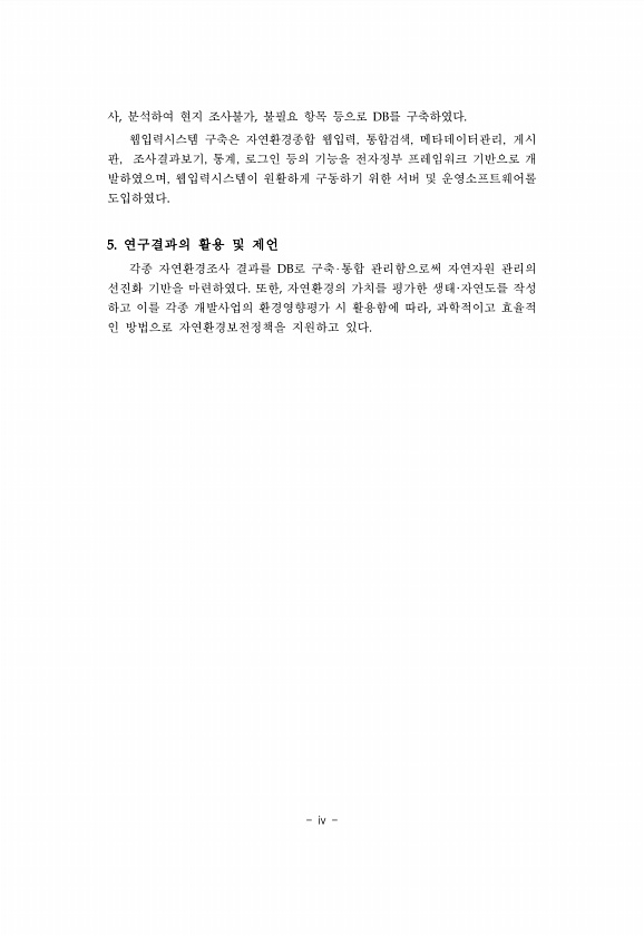 iv 사, 분석하여 현지 조사불가, 불필요 항목 등으로 DB를 구축하였다. 웹입력시스템 구축은 자연환경종합 웹입력, 통합검색, 메타데이터관리, 게시 판, 조사결과보기, 통계, 로그인 등의 기능을 전자정부 프레임워크 기반으로 개 발하였으며, 웹입력시스템이 원활하게 구동하기 위한 서버 및 운영소프트웨어롤 도입하였다. 5. 연구결과의 활용 및 제언 각종 자연환경조사 결과를 DB로 구축 통합 관리함으로써 자연자원 관리의 선진화 기반을 마련하였다. 또한, 자연환경의 가치를 평가한 생태·자연도를 작성 하고 이를 각종 개발사업의 환경영향평가 시 활용함에 따라, 과학적이고 효율적 인 방법으로 자연환경보전정책을 지원하고있다.