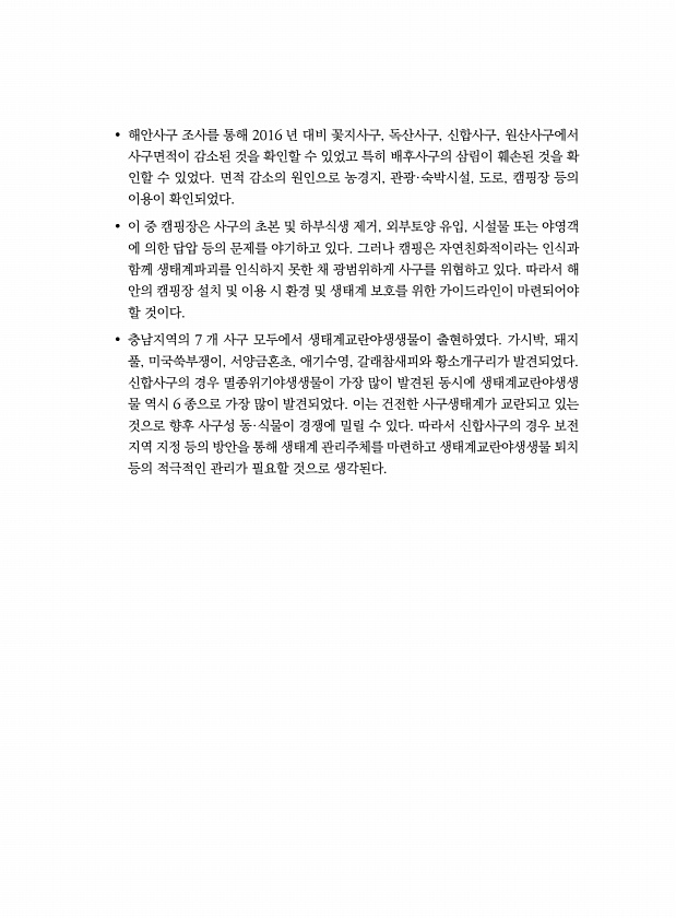 ? 해안사구 조사를 통해 2016 년 대비 꽃지사구, 독산사구, 신합사구, 원산사구에서 사구면적이 감소된 것을 확인할 수 있었고 특히 배후사구의 삼림이 훼손된 것을 확 인할 수 있었다. 면적 감소의 원인으로 농경지, 관광·숙박시설, 도로, 캠핑장 등의 이용이 확인되었다. ? 이 중 캠핑장은 사구의 초본 및 하부식생 제거, 외부토양 유입, 시설물 또는 야영객 에 의한 답압 등의 문제를 야기하고 있다. 그러나 캠핑은 자연친화적이라는 인식과 함께 생태계파괴를 인식하지 못한 채 광범위하게 사구를 위협하고 있다. 따라서 해 안의 캠핑장 설치 및 이용 시 환경 및 생태계 보호를 위한 가이드라인이 마련되어야 할 것이다. ? 충남지역의 7 개 사구 모두에서 생태계교란야생생물이 출현하였다. 가시박, 돼지 풀, 미국쑥부쟁이,...
