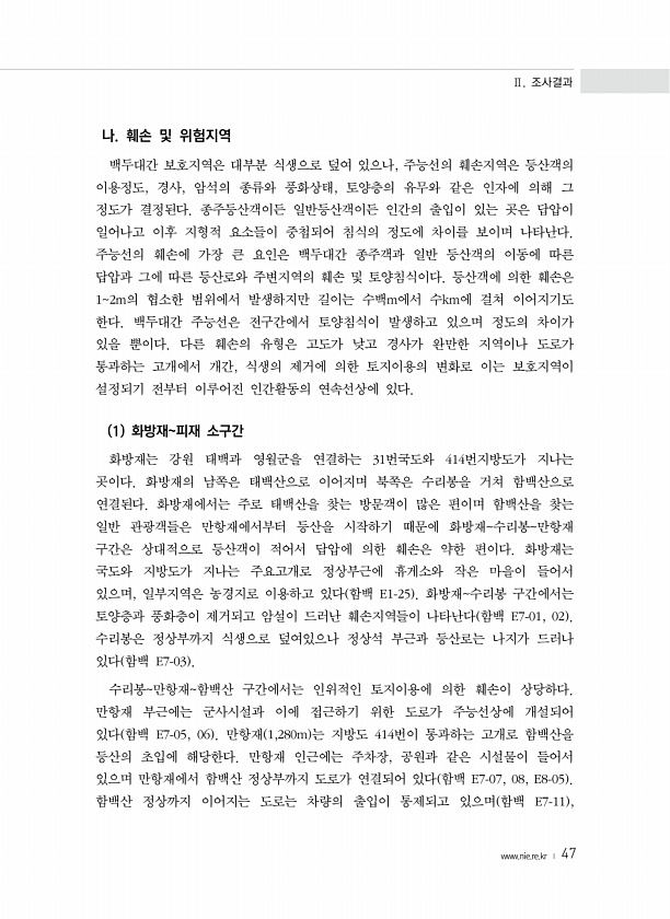 Ⅱ. 조사결과 www.nie.re.kr ? 47 나. 훼손 및 위험지역 백두대간 보호지역은 대부분 식생으로 덮여 있으나, 주능선의 훼손지역은 등산객의 이용정도, 경사, 암석의 종류와 풍화상태, 토양층의 유무와 같은 인자에 의해 그 정도가 결정된다. 종주등산객이든 일반등산객이든 인간의 출입이 있는 곳은 답압이 일어나고 이후 지형적 요소들이 중첩되어 침식의 정도에 차이를 보이며 나타난다. 주능선의 훼손에 가장 큰 요인은 백두대간 종주객과 일반 등산객의 이동에 따른 답압과 그에 따른 등산로와 주변지역의 훼손 및 토양침식이다. 등산객에 의한 훼손은 12m의 협소한 범위에서 발생하지만 길이는 수백m에서 수km에 걸쳐 이어지기도 한다. 백두대간 주능선은 전구간에서 토양침식이 발생하고 있으며 정도의 차이가 있을 뿐이다....