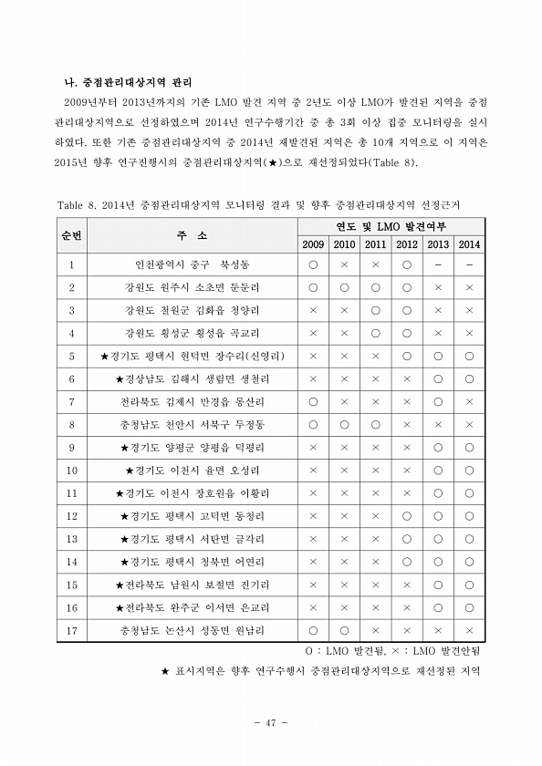 47 나. 중점관리대상지역 관리 2009년부터 2013년까지의 기존 LMO 발견 지역 중 2년도 이상 LMO가 발견된 지역을 중점 관리대상지역으로 선정하였으며 2014년 연구수행기간 중 총 3회 이상 집중 모니터링을 실시 하였다. 또한 기존 중점관리대상지역 중 2014년 재발견된 지역은 총 10개 지역으로 이 지역은 2015년 향후 연구진행시의 중점관리대상지역 ★ 으로 재선정되었다 Table 8 순번 주 소 연도 및 LMO 발견여부 2009 2010 2011 2012 2013 2014 1 인천광역시 중구 북성동 ○ × × ○ 2 강원도 원주시 소초면 둔둔리 ○ ○ ○ ○ × × 3 강원도 철원군 김화읍 청양리 × × ○ ○ × × 4 강원도 횡성군 횡성읍 곡교리 × × ○ ○ × × 5 ★경기도 평택시 현덕...