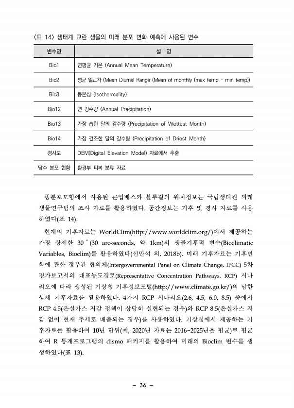 36 변수명 설 명 Bio1 연평균 기온 Annual Mean Temperature Bio2 평균 일교차 Mean Diurnal Range Mean of monthly max temp min temp Bio3 등온성 Isothermality Bio12 연 강수량 Annual Precipitation Bio13 가장 습한 달의 강수량 Precipitation of Wettest Month Bio14 가장 건조한 달의 강수량 Precipitation of Driest Month 경사도 DEM Digital Elevation Model 자료에서 추출 담수 분포 현황 환경부 피복 분류 자료 표 14 생태계 교란 생물의 미래 분포 변화 예측에 사용된 변수 종분포모형에서 사용된 큰입배스와 블루길의 위치정보는 국립생태원...