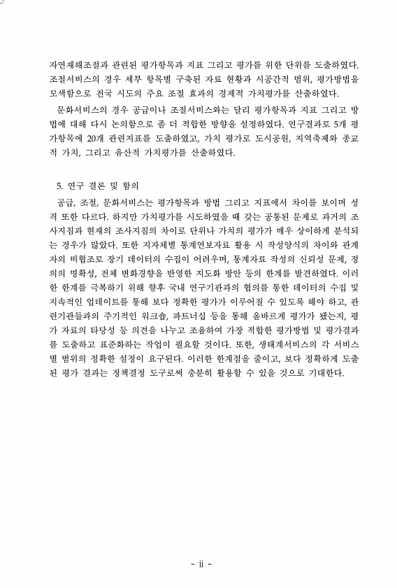 ii 자연재해조절과 관련된 평가항목과 지표 그리고 평가를 위한 단위를 도출하였다. 조절서비스의 경우 세부 항목별 구축된 자료 현황과 시공간적 범위, 평가방법을 모색함으로 전국 시도의 주요 조절 효과의 경제적 가치평가를 산출하였다. 문화서비스의 경우 공급이나 조절서비스와는 달리 평가항목과 지표 그리고 방 법에 대해 다시 논의함으로 좀 더 적합한 방향을 설정하였다. 연구결과로 5개 평 가항목에 20개 관련지표를 도출하였고, 가치 평가로 도시공원, 지역축제와 종교 적 가치, 그리고 유산적 가치평가를 산출하였다. 5. 연구 결론 및 함의 공급, 조절, 문화서비스는 평가항목과 방법 그리고 지표에서 차이를 보이며 성 격 또한 다르다. 하지만 가치평가를 시도하였을 때 갖는 공통된 문제로 과거의 조 사지침과 현재의 조사지...