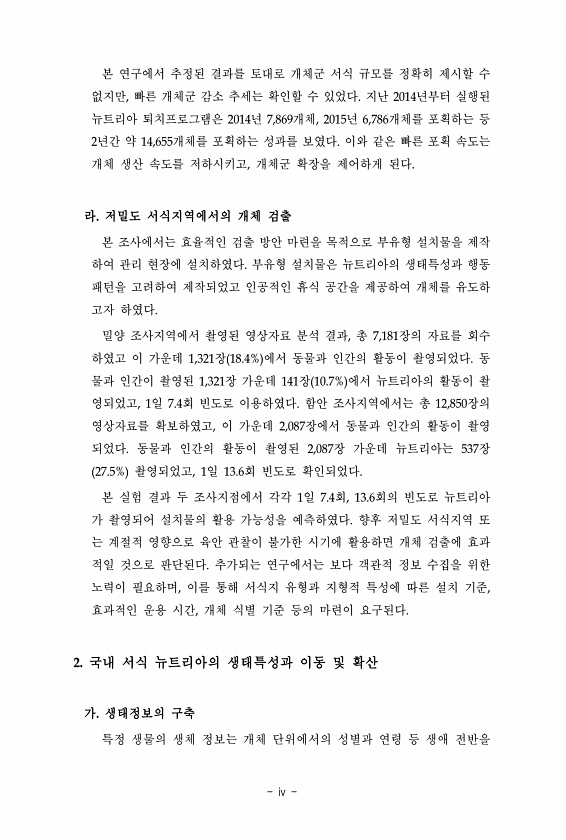 본 연구에서 추정된 결과를 토대로 개체군 서식 규모를 정확히 제시할 수 없지만, 빠른 개체군 감소 추세는 확인할 수 있었다. 지난 2014년부터 실행된 뉴트리아 퇴치프로그램은 2014년 7,869개체, 2015년 6,786개체를 포획하는 등 2년간 약 14,655개체를 포획하는 성과를 보였다. 이와 같은 빠른 포획 속도는 개체 생산 속도를 저하시키고, 개체군 확장을 제어하게 된다. 라. 저밀도 서식지역에서의 개체 검출 본 조사에서는 효율적인 검출 방안 마련을 목적으로 부유형 설치물을 제작 하여 관리 현장에 설치하였다. 부유형 설치물은 뉴트리아의 생태특성과 행동 패턴을 고려하여 제작되었고 인공적인 휴식 공간을 제공하여 개체를 유도하 고자 하였다. 밀양 조사지역에서 촬영된 영상자료 분석 결과, 총 7,181장의...