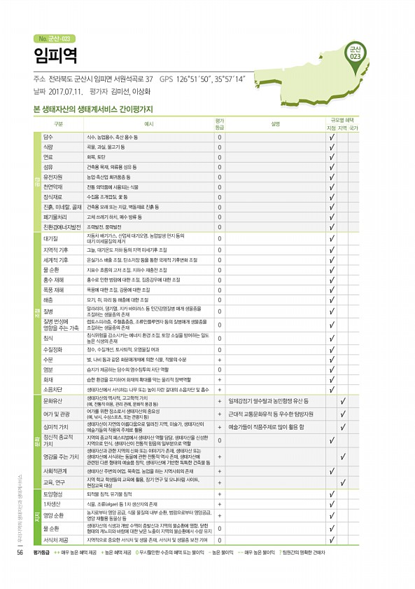 No. 군산- 군산 023 본 생태자산의 생태계서비스 간이평가지 구분 예시 평가 등급 설명 규모별 혜택 지점 지역 국가 공급 담수 식수, 농업용수, 축산 용수 등 0 √ 식량 곡물, 과실, 물고기 등 0 √ 연료 화목, 토탄 0 √ 섬유 건축용 목재, 의류용 섬유 등 0 √ 유전자원 농업·축산업 희귀품종 등 0 √ 천연약재 전통 의약품에 사용되는 식물 0 √ 장식재료 수집용 조개껍질, 꽃 등 0 √ 진흙, 미네랄, 골재 건축용 모래 또는 자갈, 벽돌재료 진흙 등 0 √ 폐기물처리 고체 쓰레기 하치, 폐수 방류 등 0 √ 친환경에너지발전 조력발전, 풍력발전 0 √ 조절 대기질 자동차 배기가스, 산업체 대기오염, 농업발생 먼지 등의 대기 미세물질의 제거 0 √ 지역적 기후 그늘, 대기온도 저하 등의 지역 미세기...
