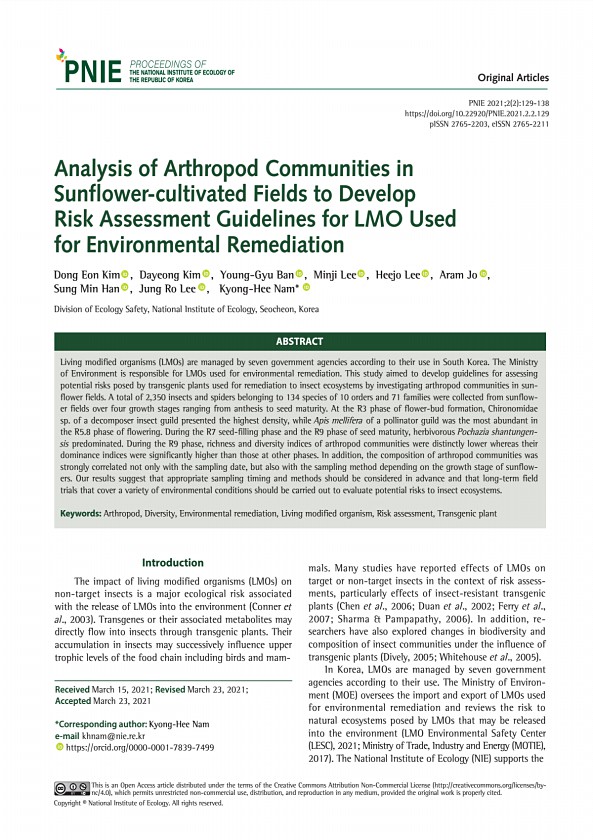 Dong Eon Kim , Dayeong Kim , Young-Gyu Ban , Minji Lee , Heejo Lee , Aram Jo , Sung Min Han , Jung Ro Lee , Kyong-Hee Nam* The impact of living modified organisms LMOs on non-target insects is a major ecological risk associated with the release of LMOs into the environment Conner et al., 2003 Transgenes or their associated metabolites may directly flow into insects through transgenic plants. Their...
