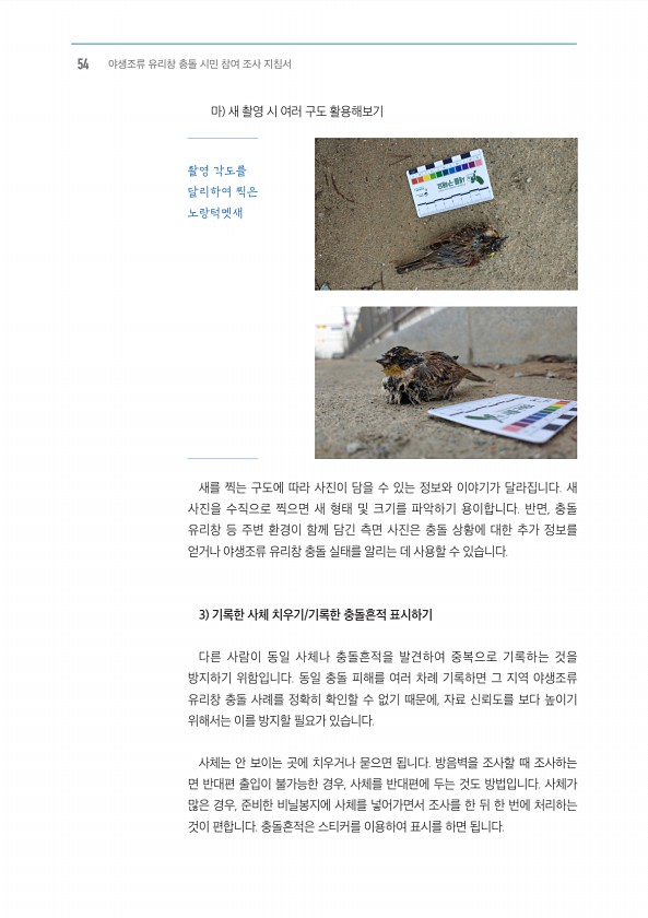 마 새 촬영 시 여러 구도 활용해보기 새를 찍는 구도에 따라 사진이 담을 수 있는 정보와 이야기가 달라집니다. 새 사진을 수직으로 찍으면 새 형태 및 크기를 파악하기 용이합니다. 반면, 충돌 유리창 등 주변 환경이 함께 담긴 측면 사진은 충돌 상황에 대한 추가 정보를 얻거나 야생조류 유리창 충돌 실태를 알리는 데 사용할 수 있습니다. 3 기록한 사체 치우기/기록한 충돌흔적 표시하기 다른 사람이 동일 사체나 충돌흔적을 발견하여 중복으로 기록하는 것을 방지하기 위함입니다. 동일 충돌 피해를 여러 차례 기록하면 그 지역 야생조류 유리창 충돌 사례를 정확히 확인할 수 없기 때문에, 자료 신뢰도를 보다 높이기 위해서는 이를 방지할 필요가 있습니다. 사체는 안 보이는 곳에 치우거나 묻으면 됩니다. 방음벽을 조사할 때 ...