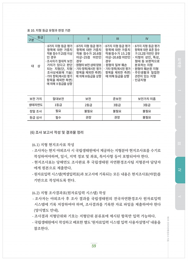 59 제5차 전국자연환경조사 지침 표 10. 지형?등급?유형과?판정?기준 생태자연도 구분 대 상 · 8가지?지형?등급?평가 항목에? 대한? 가중치 적용?점수가 25점?이상 인?경우 ·조사자가?절대적?보전 가치가? 있다고? 판단 되는? 지형 단, 지형 조사상세표에? 기술 ·기타?항목 제시된?평가 항목을?제외한?측면 에?의해 Ⅱ등급을?상향 등급 보전?가치 정밀?조사 등급?심사 절대보전 1등급 필요 필수 Ⅰ Ⅱ · 8가지?지형?등급?평가 항목에? 대한? 가중치 적용? 점수가 20.8점 이상25점? 미만인 경우 · 원형의?보전?상태?양호 · 기타?항목 제시된 평가 항목을?제외한?측면 에?의해 Ⅲ등급을?상향 Ⅲ Ⅳ 보전 2등급 불필요 권장 준보전 3등급 불필요 권장 보전가치?미흡 3등급 불필요 불필요 6 조사?보고서...