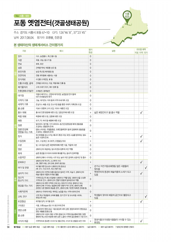 군산 001 No. 시흥 시흥 023 본 생태자산의 생태계서비스 간이평가지 구분 예시 평가 등급 설명 규모별 혜택 지점 지역 국가 공급 담수 식수, 농업용수, 축산 용수 등 0 식량 곡물, 과실, 물고기 등 0 연료 화목, 토탄 0 섬유 건축용 목재, 의류용 섬유 등 0 유전자원 농업·축산업 희귀품종 등 0 천연약재 전통 의약품에 사용되는 식물 0 장식재료 수집용 조개껍질, 꽃 등 0 진흙,미네랄, 골재 건축용 모래 또는 자갈, 벽돌재료 진흙 등 0 폐기물처리 고체 쓰레기 하치, 폐수 방류 등 0 친환경에너지발전 조력발전, 풍력발전 0 조절 대기질 자동차 배기가스, 산업체 대기오염, 농업발생 먼지 등의 대기 미세물질의 제거 0 지역적 기후 그늘, 대기온도 저하 등의 지역 미세기후 조절 0 세계적 기후 온실가...