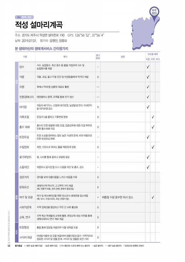 No. 파주- 파주 023 본 생태자산의 생태계서비스 간이평가지 구분 예시 평가 등급 설명 규모별 혜택 지점 지역 국가 공급 담수 식수, 농업용수, 축산 용수 등 물을 저장하여 식수 및 농업용수를 제공 √ 식량 곡물, 과실, 물고기 등 인간 및 야생동물에게 먹거리 제공 0 √ 자원 목재나 약재 등 상품의 재료로 활용 -- √ 친환경에너지 태양열이나 풍력, 조력을 통해 전기 생산 -- √ 조절 대기질 자동차 배기가스, 산업체 대기오염, 농업발생 먼지, 미세먼지 등 대기오염 감소 0 √ 기후조절 온실가스를 줄이고 기후변화 완화 0 √ 홍수 재해 홍수로 인한 범람에 대한 조절, 집중강우에 대한 조절 폭우로 인한 홍수피해 저감 0 √ 토양유실 토양 소실을 방어하는 밀도 높은 식생의 존재, 비와 바람으로 인한 토양유...