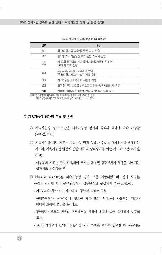 38 DMZ 생태포럼 DMZ 일원 생태적 지속가능성 평가 및 활용 방안 년도 내용 2001 최초의 국가의 지속가능발전 지표 도출 2003 분야별 지속가능발전 지표 통합 지수화 방안 2005 제 10회 환경의날 기념 국가지속가능발전비전 선언 169개의 지표 선정 2006 국가지속가능발전 이행계획 수립 77개의 국가지속가능발전 지표 확정 2007 지속가능발전 기본법과 시행령 시행 2008 최근 5년간의 자료를 바탕으로 지속가능발전지표의 시범적용 2016 지표의 개정작업을 통한 84개의 국가지속가능발전지표 자료경기개발연구원 2008 , 경기도 지속가능성 평가 체계 구축방안 연구. 지속가능발전위원회 2016 국가 지속가능성 보고서 ’12’14 참조 [표 3-2] 국가단위 지속가능성 평가의 발전 과정 4 지속가능성 ...
